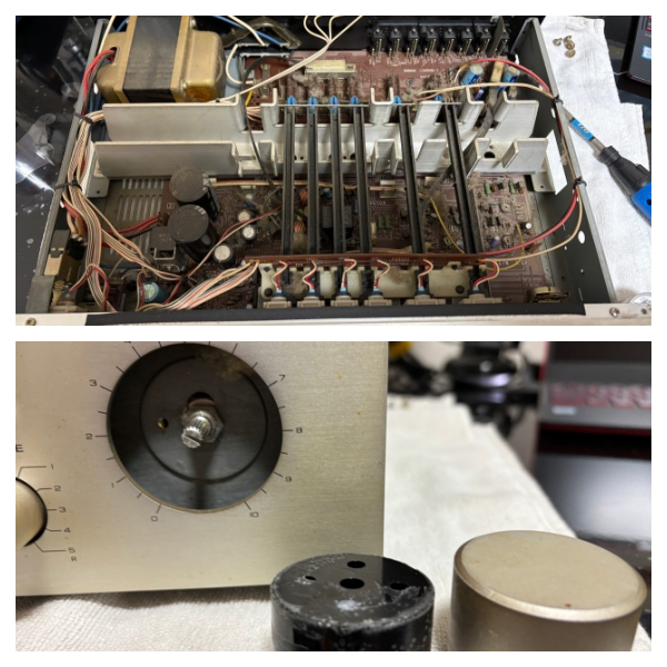 そこで、Yahooオークションを眺めてみる。どうやら高くても1万円ほどで落札されている模様。できるだけ程度の良いものが出品されればと思っていたのですが、たま数が少なくなかなか・・・ ちょっと怪しさはあったものの一品落札しました。手元に届いて、やっぱりでした。全体的にタバコのヤニにまみれた埃付き。正面のスイッチ類はなぜか取れて空回り。このアンプのアイデンティティともいえる出力を示すランプもつかない(これはアナウンスどおり)。各つまみを動かすとガリはあるものの、幸い音は出るようです。