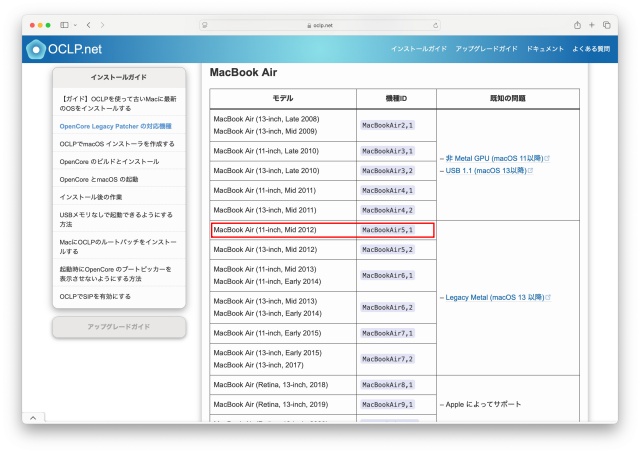 OCLPに対応している機種かどうかを調べてみましょう。OCLP.net で調べることができます。ここからお持ちのMacの情報を見ることができます。 少し下へスクロールすると、幸いにも私のMBA11 mid2012 を発見。もし、対応していなければ他の使い方を考える必要があるかもしれません。例えばですけど、macのWindows機とか・・・
