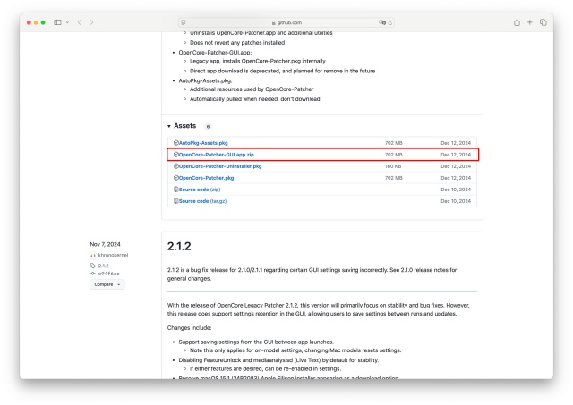新しいページが立ち上がり、下へ少しスクロールすると、Asset の部分があります。6つほどありますが、私は、 OpenCore-Patcher-GUI.app.zip を選択しダウンロードしました。