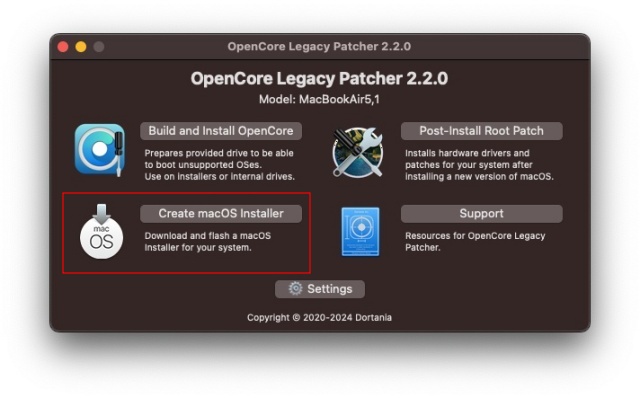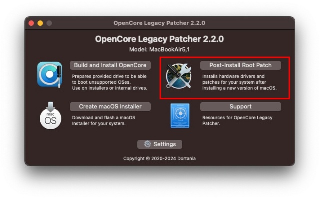 ダウンロードしたファイルの中から、OpenCore-Patcher.appを実行します。私がインストールした時点の最新バージョンは、2.2.0でした。