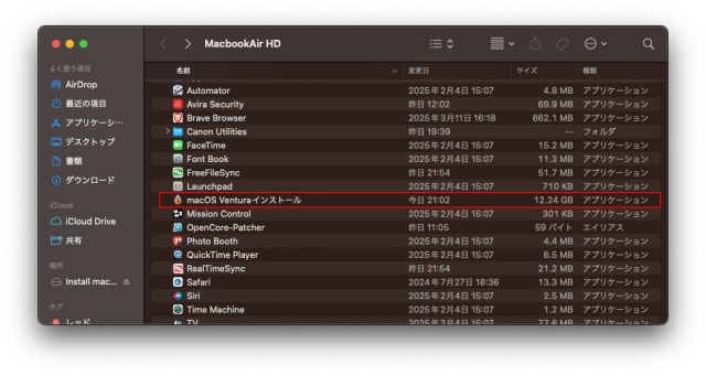 ここで選択したmacOSのインストーラはアプリケーションフォルダにダウンロード保存されています。