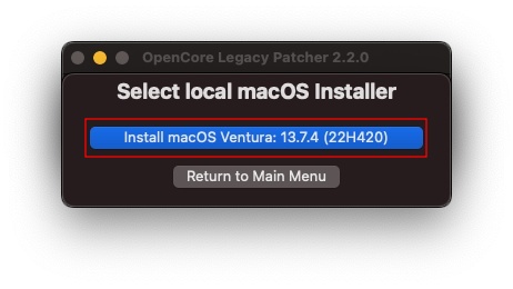 いくつかのバージョンをダウンロードした場合は、ここに複数表示されるようです。今回は、Ventura しかダウンロードしていませんので、選択肢は一つのみです。