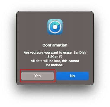 USBメモリをフォーマットしてよいか確認してきますので、USBメモリ内のデータは必ず確認しておいてください。全て消えてしまいます。ファーマットしてよければ、Yes をクリックして次に進みます。
