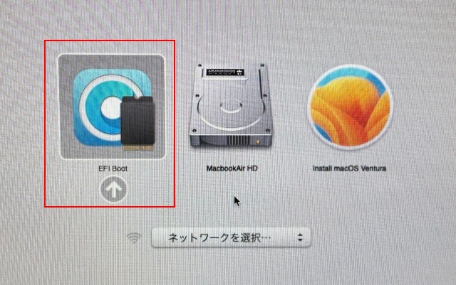 option キーを押しながら電源を入れます。下の画面が表示されますが、必ず EFI BOOTを選択してください。間違ってもVentura のアイコンに騙されてはいけません。