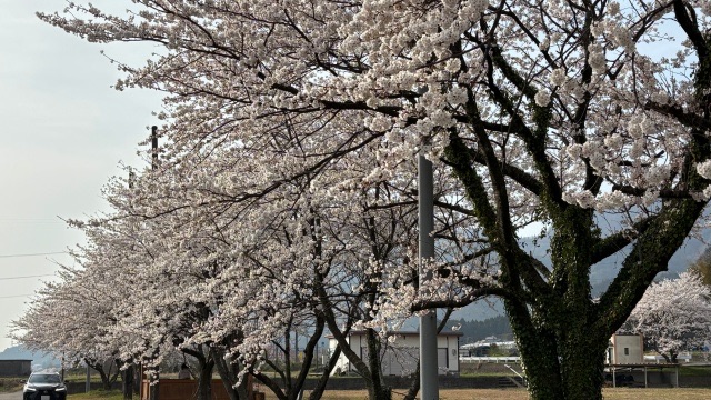 で、車を走らせていたら、道路脇のちっちゃな公園?の周りに植えられた桜が満開! 道路から見ると、なんだかドラマのワンシーンに出てくるかもしれないような感じ。行ってみよう。道路の方は交通量が多く危険なので、反対側の農道に車を停める。桜の種類が違うのかな?まだ満開のまま重そうに花がついている。「世間から見向きもされない場所に咲き誇る桜が、一番美しいのかもしれないなあ」なんてことを考えてました。「儚さ」に「侘び寂び」を感じるのが日本人の感性なんでしょうか?というわけで、本日の風景をご覧ください。