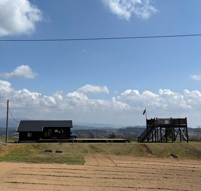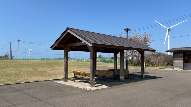 風車の迫力に圧倒されっぱなしだったけれど、畑の方を見ると何やら展望台らしきものがあるではありませんか。その横にはお店らしき建物も。ちょうど喉も乾いてきたところだったので、「カフェだといいな」なんて思いながら早速行ってみました。この建物は、「風羽里」という農物産直売所。この日は悪天候のためお休みとのこと。確かに天気はいいのだけれど、風が強いせいか・・・。残念。