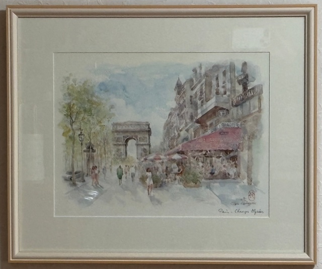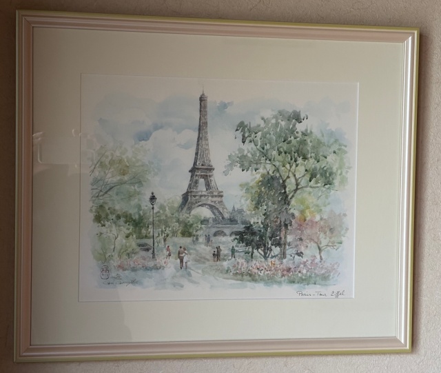 玄関とリビングにかけてあるのは新婚旅行でパリを訪れた時に買ったもの。今でもそうなのでしょうか?当時、パリの街を歩くと、至る所で風景を描いている人たちがそこかしこにいたことを覚えています。きっとその人たちが描いたのでしょう。街にある売店の一角に4枚1,000円ほどで売られていた水彩画を見つけました。絵心のない私ですが、なぜか素敵に感じられ、安かったこともあって思わず購入してしまいました。日本に帰ったら飾ろうと思っていたので、いかに折り目を付けず持ち帰るかが大変でした。