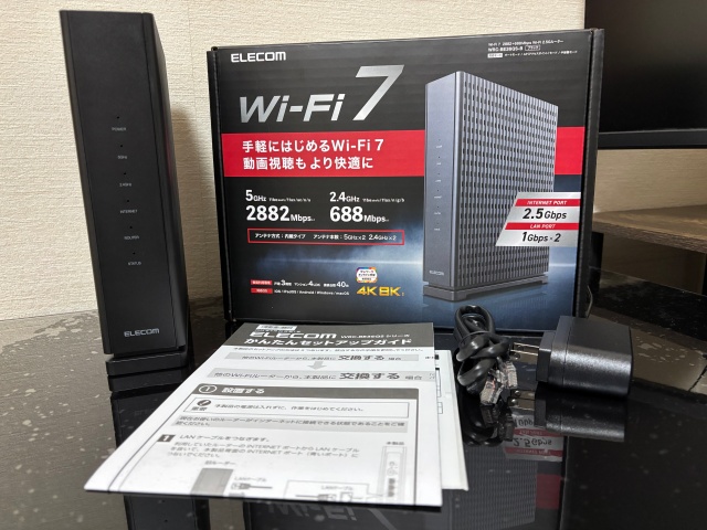 TP-Link AX73は、WiFi 6 ルーターなので、交換するとなれば WiFi 7 ルーター ということになります。国産メーカーの物を購入しようと思い、LAN関連の商品が並ぶコーナーへ行ったのですが、希望の品となるとかなりお高い。我慢しようかと諦めかけていると、1万円ちょっとの WiFi 7 ルーター を見つけました。ELECOMさんの「WRC-BE36QS」。ただアンテナは内蔵型だし、壁掛けにはできないタイプ。それになぜか箱に書いてあるスピードも TP-Link AX73 より遅い・・・ どうしたものかと悩んでいたのですが、一度購入して試してみることに。もし具合が悪かったらアクセスポイントにでもすればいいので・・・ それに背面にはギガの有線端子もあるので、何かには使えるでしょう・・・きっとそのはず・・・