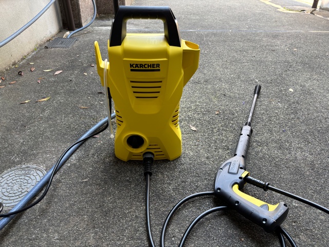 今回使用した高圧洗浄機は、ケルヒャーのK1Xという一番の入門モデル。以前使っていたケルヒャーの高圧洗浄機が壊れてしまったため2台目ということになります。この機種にしたのは単に価格が安かったらという、実に消極的な理由なのです。本来なら、用途を考えてより目的に合った物を購入するのが本当なのでしょうが予算は限られています。ダメならダメでそんなレポートにすればいいやという、よく言えば潔く、悪く言えば開き直った考えだったのです。